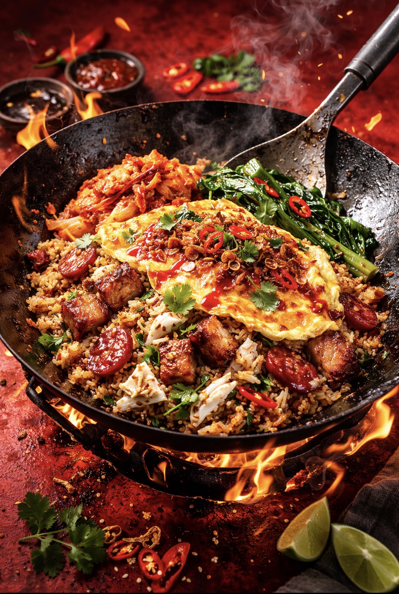 Fried rice with crispy pork, lap cheong, crab, shallot omelette, kimchi and wilted greens.