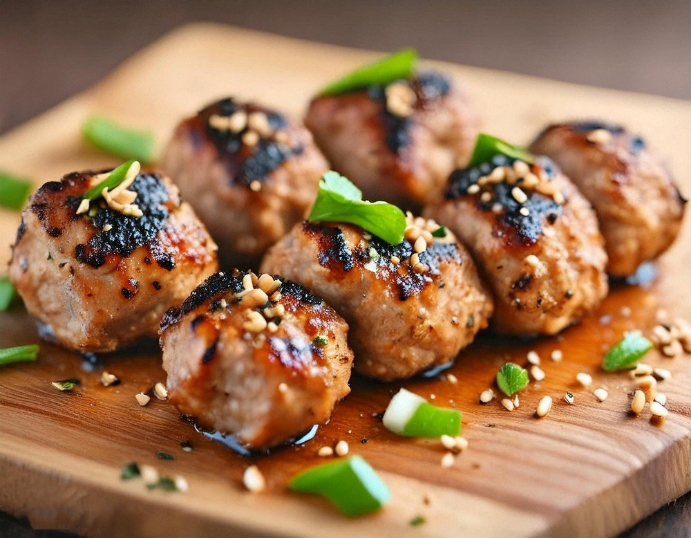 Tokyo style chicken meatballs seasoned with shiso and secret spices, Char grilled and glazed with a glossy sweet soy.
